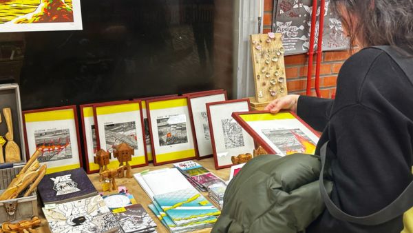 À l’intérieur : un marché artistique décalé où une vingtaine d’artistes proposent des créations à prix doux de 1 à 100€. Affiches, dessins, objets, petites sculptures… venez déambuler dans nos rayons flambant neufs et faire le plein de cadeaux vraiment originaux (ou vous faire plaisir, pas de jugement ) …ou juste vous poser pour un goûter dans notre coin gourmand.